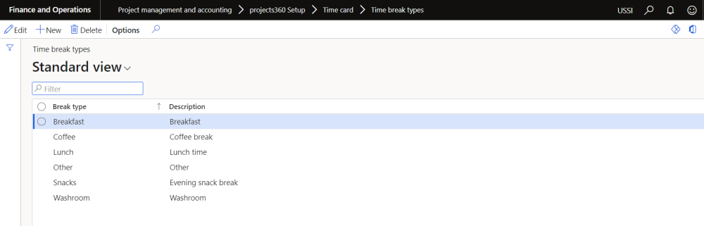 Go to Project management and accounting > projects360 setups > Time card > Time break types