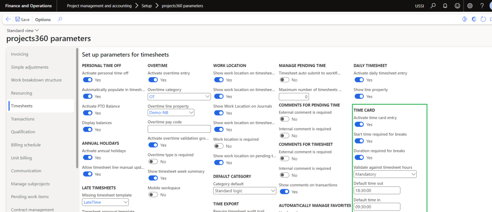 On projects360 parameter form, under Timesheets tab, a new parameter “‘Activate time card entry” has been introduced to enter time card on timesheets. User needs to set the ‘Activate time card entry’ field value to ‘Yes’ in order to use this feature.