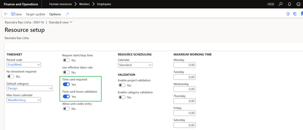 On employees form, under Project setup, a new parameter “‘Time card required” has been introduced to make this functionality available to selected/desired resources. User needs to set the ‘Time card required’ field value to ‘Yes’ on resources to activate time card for the resource to fill in the time card information from timesheets.