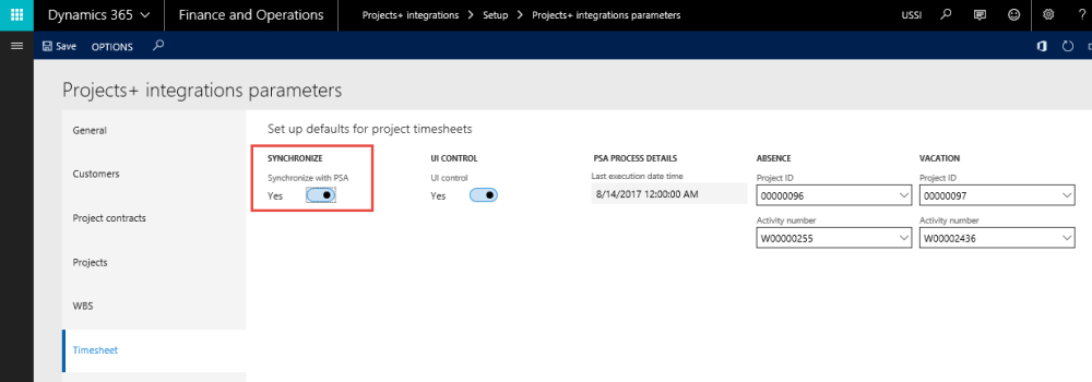 • UI control – This checkbox controls view of Project Service Automation application (PSA) data. If this field is enabled, then users can navigate to Project Service Automation application (PSA) data from Microsoft Dynamics 365 for Finance and Operations workspace, Integration log and resource forms.