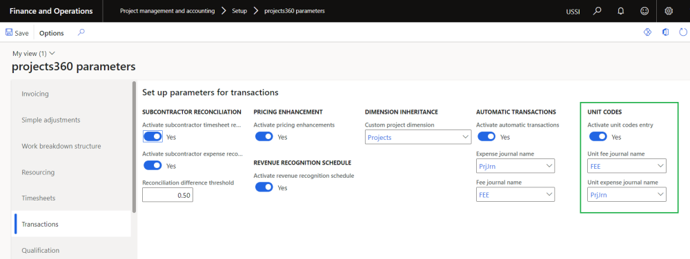 On projects360 parameter form, under Transactions tab, a new parameter “Activate unit codes entry” has been introduced to enter unit code without using timesheet. User needs to set the ‘Activate unit codes entry’ field value to ‘Yes’ in order to use this feature.