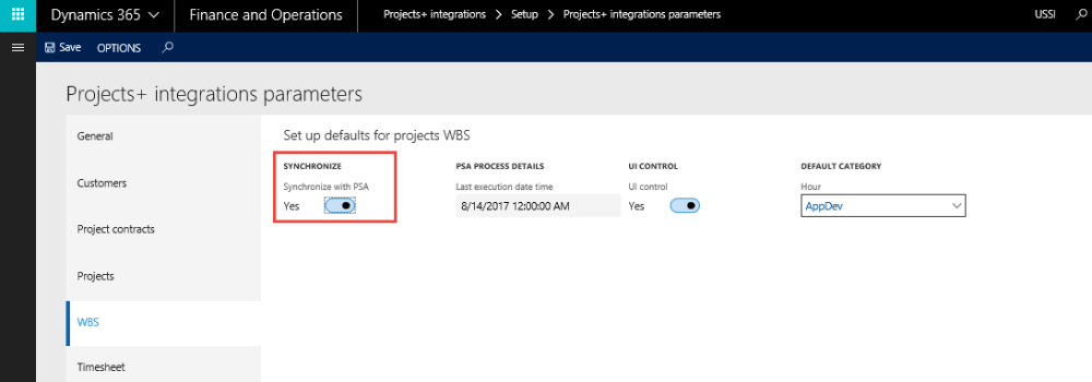 - UI control – This checkbox controls view of Project Service Automation application (PSA) data and provides the navigation to view the Project Service Automation application (PSA) data from Microsoft Dynamics 365 for Finance and Operations workspaces, Integration logs and Projects.