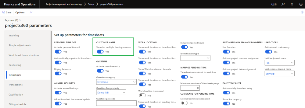 On projects360 parameter form, under Timesheet tab, a new parameter “Show for multiple funding sources” is been introduced to display “customer name” from the project when project contract has multiple funding sources.