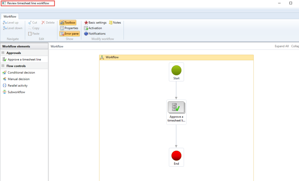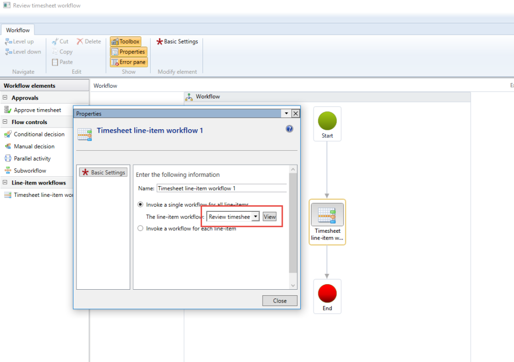 Iinvoke the above created timesheet line level workflow in Review timesheet workflow as shown below: