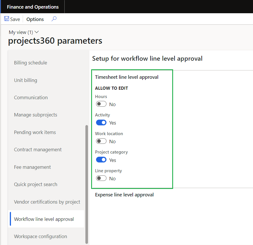 On projects360 parameter form, under Workflow line level approval tab, a new set of parameters under the “Timesheet line level approval” has been introduced to allow edit of few fields on Timesheet line level approval form. User needs to set the field value to ‘Yes’ in order to edit particular fields accordingly.