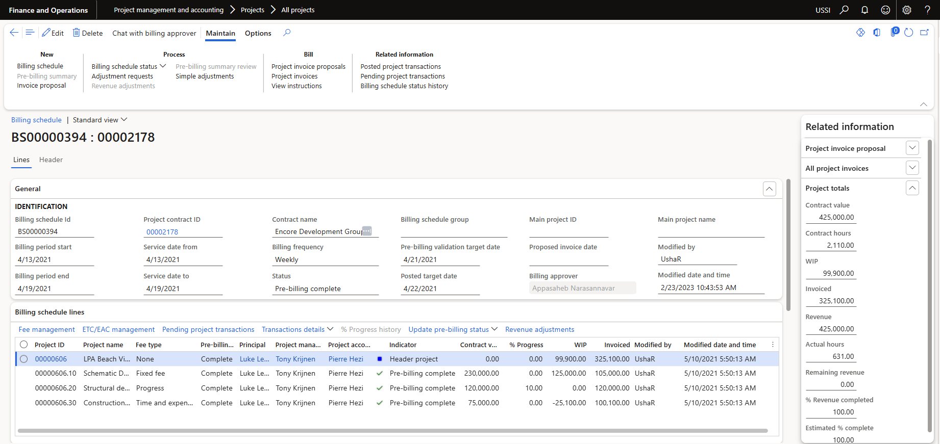 Go to Project management and accounting > Projects > All projects > Billing schedule tab > Billing schedule button > Select Billing schedule ID.