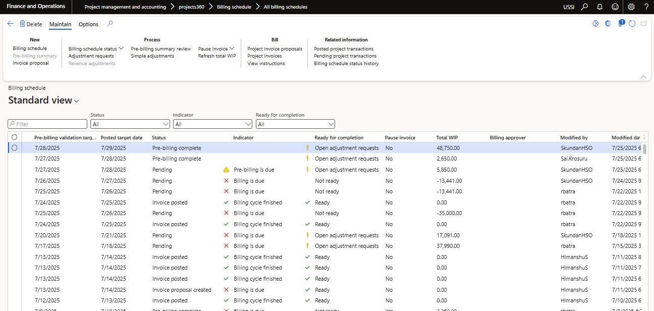 | Ready for completion | Displays the billing schedule status by enabling users to filter using a new indicator, similar to the existing ‘Indicator’ filter referenced in the section above. |