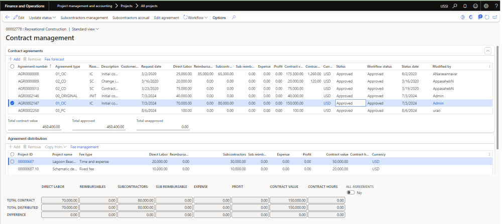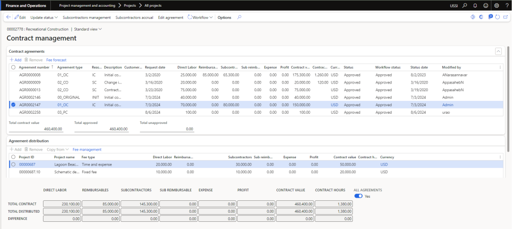 This grid allows to create new agreements and change orders. Once the agreements are approved, contract values and contract hours are updated to fee management form as the project contract values and hours. Simultaneously upon the approval, fee forecasts are also created for the agreement lines, but the base for fee forecasts will agreement distributions. User cannot reject contract agreement if there are open invoice proposals linked to the contract ID. This restriction will prevent any updates to the agreement until the open invoice proposal is either posted or deleted.