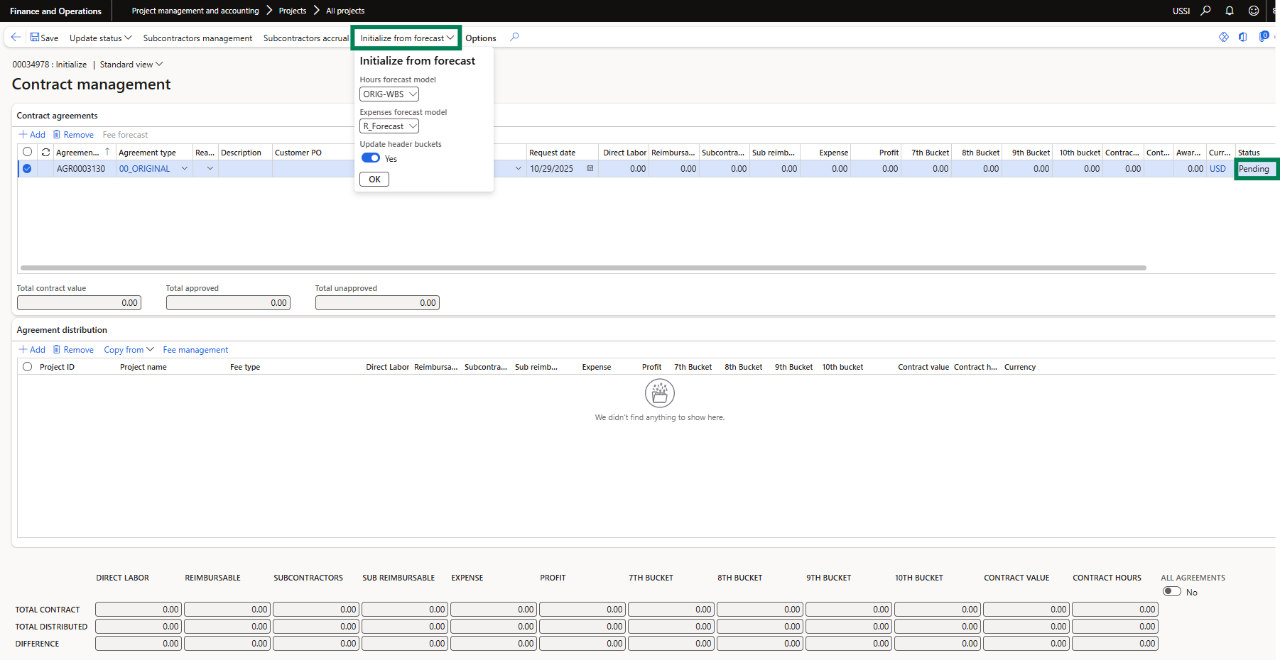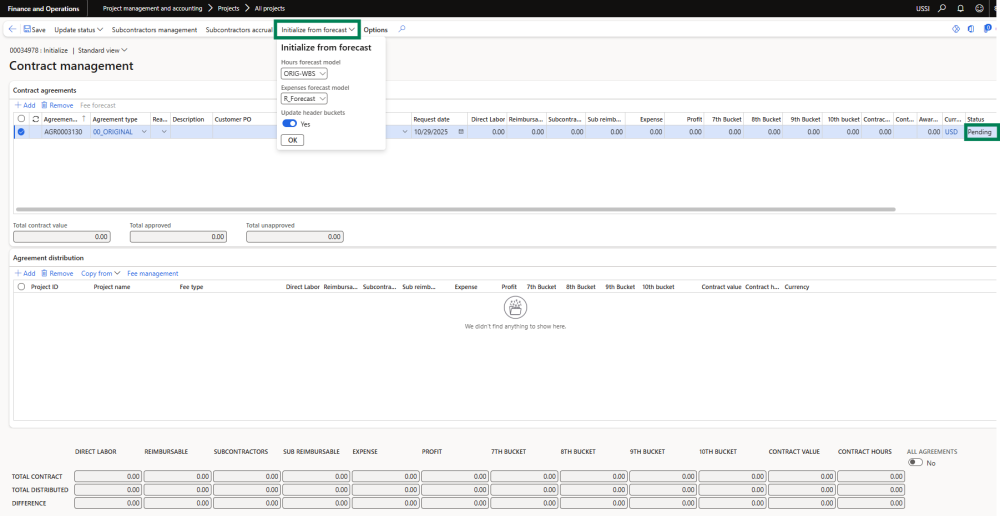 A new button, Initialize from Forecast, has been introduced on the Contract Management form. This button is available only when the contract header status is Pending.