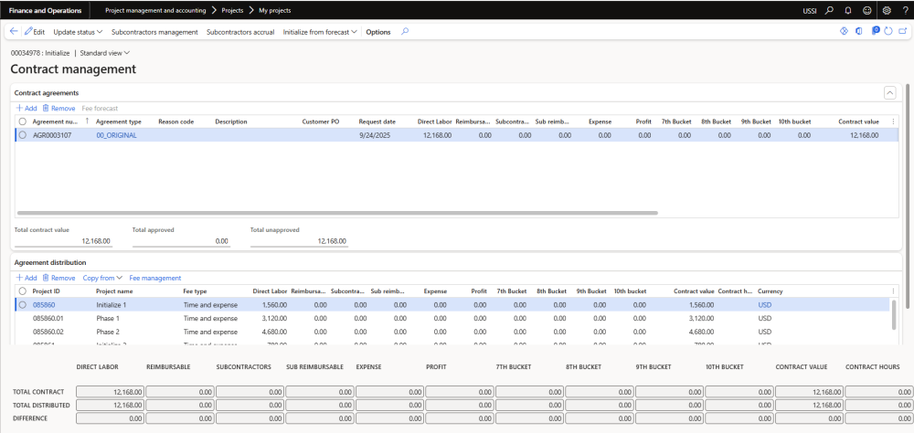 | Total distributed | Shows the sum of contract value distributed to projects so far for an agreement line selected in the top grid. |