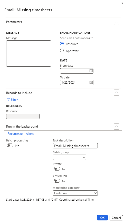 Email missing timesheet periodic process helps in sending email for late/missing timesheet to the selected resource/approver or all resources/approver through batch process. This process minimizes manual intervention and can be scheduled on periodic basis.