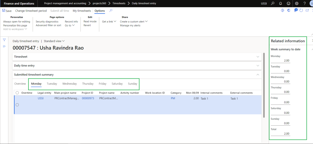 A new form ‘Daily timesheet entry’ is added which allows users to quickly enter time on daily basis and submit. This new form provides the details on how many hours is pending to submit and the submitted hours. User has an option to change the timesheet period and look at the time information on daily basis. Similar options are provided to to copy the timesheet from the previous timesheet or favorites or from assignments.