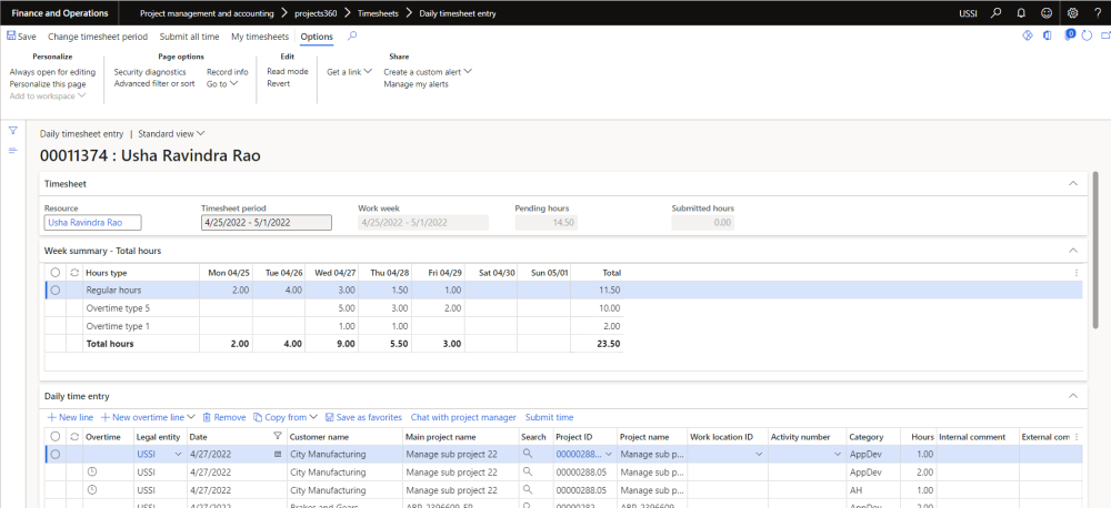 Go to Project management and accounting > projects360 > Timesheets > Daily timesheet entry