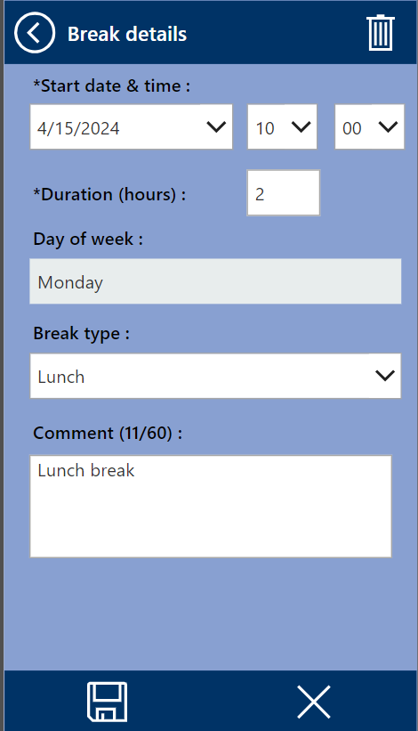- Break Details : When users are on the “Time Card” form, they can add break details by clicking the “+” button at the bottom. This will open the “Break details” section, where they can: