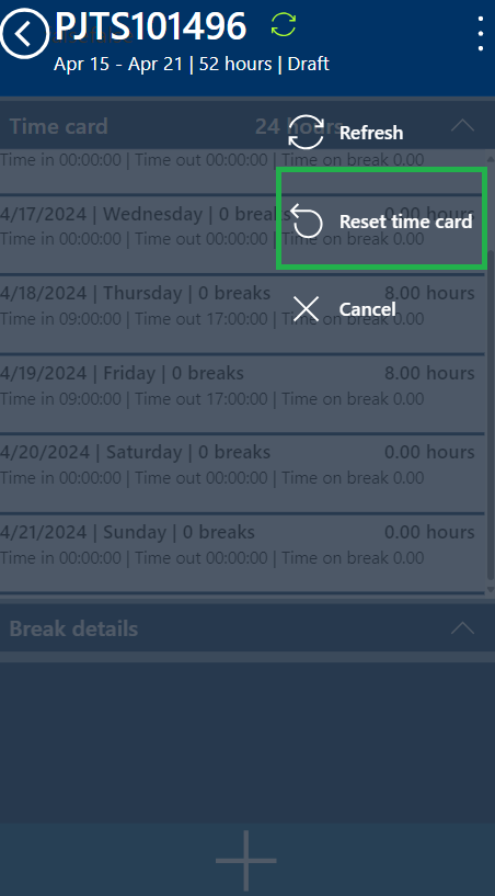 Clicking on the menu option allows the user to reset the time card, mirroring the functionality present in FO.