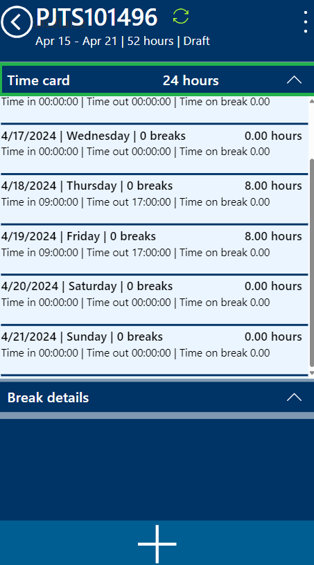 Upon selecting the menu option, a new form for time card entry will open, corresponding to the current timesheet header. This form comprises two fast tabs: “Time card” and “Break details.