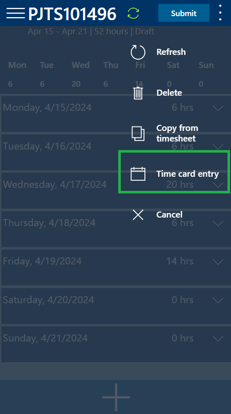 A new menu option called “Time Card Entry” is added to the timesheet application’s overview form. This allows users to easily access and complete your timesheets.