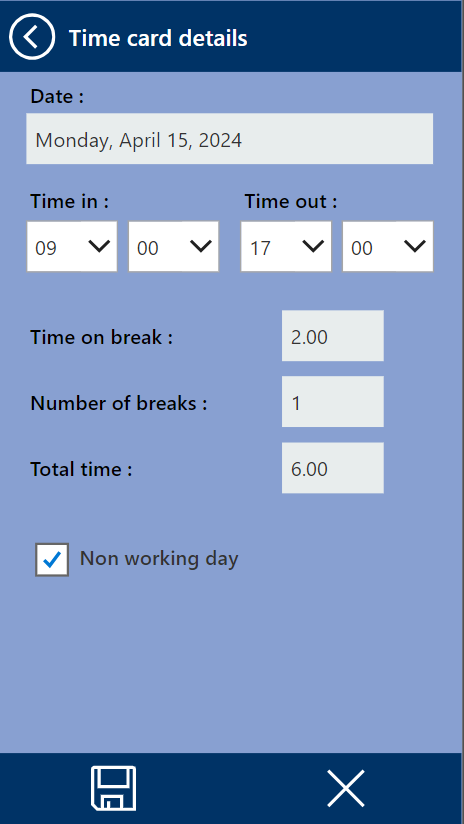 - Users can edit existing time card entries and break details on the “Time Card” form. Once they have modified a break detail for a specific date, the system automatically updates the following: