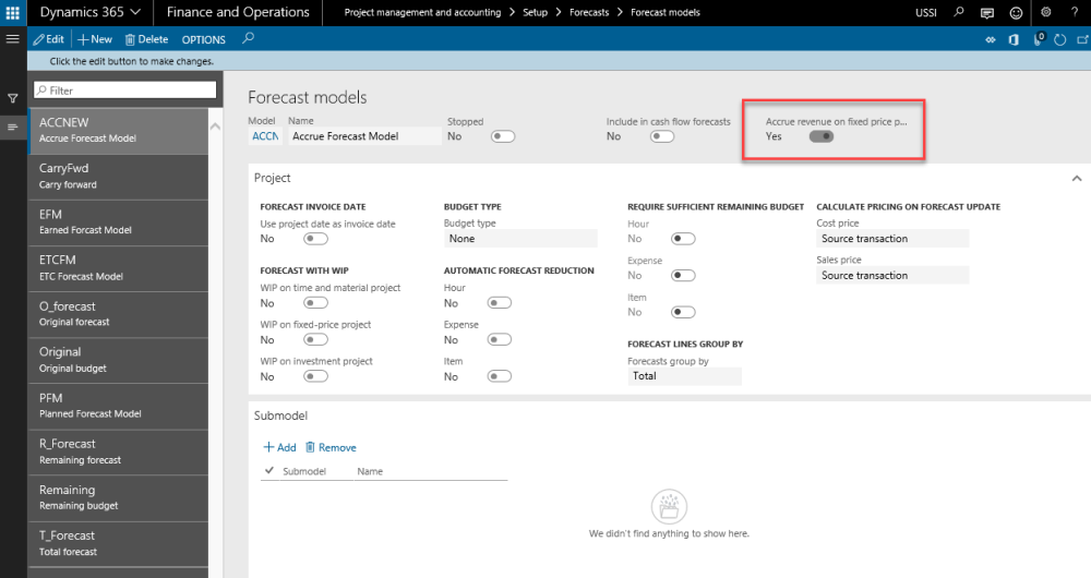 Go to Project management and accounting > Setup > Forecasts > Forecast models