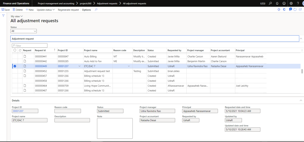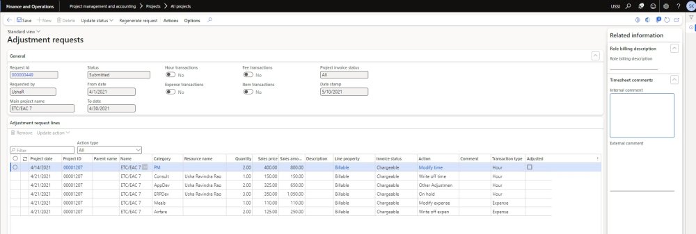 New form is introduced to view all the created adjustment request for a project. This form helps to generate adjustment request and view the status of the same. This form provides the details of all the generated requests for each project and can define the adjustment action to be taken on each transaction and can also provide any comments by the project manager.