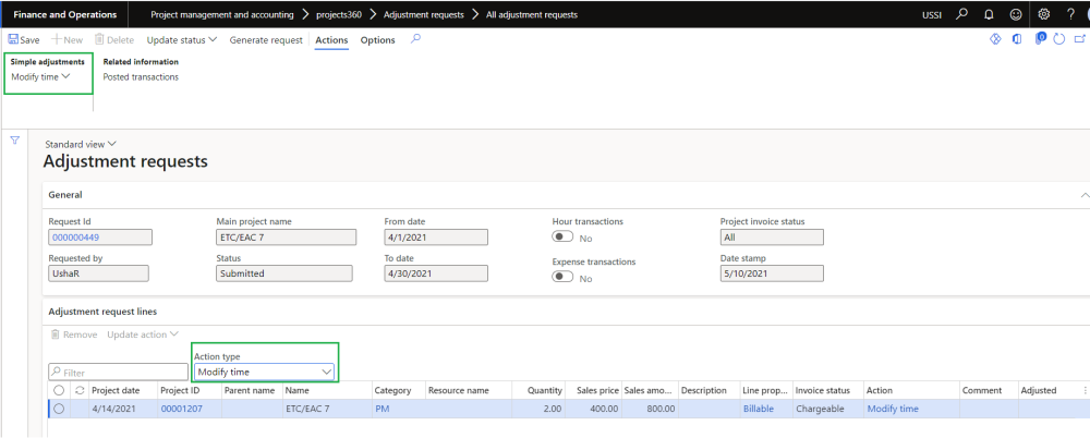 Once the user submits the adjustment request, option is provided to perform adjustment actions through the simple adjustment buttons. New field “Action type” is added on the Adjustment request lines tab where the user can select required action to be performed. By default action type will be “All”. Based on the action type selected simple adjustment buttons get displayed. Ex: If Modify time action type is selected then “Modify time” button is displayed. If the user updates the action type to ‘On hold’ or ‘on hold billing’, these transactions will be included in the next adjustment request process.