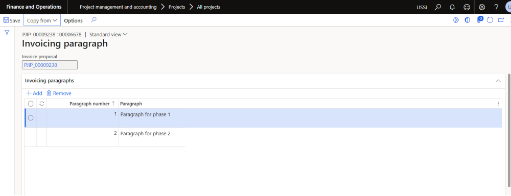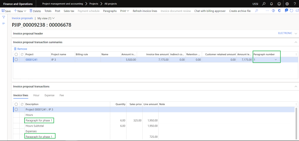 Go to Project management and accounting > Projects > All projects > Project invoice proposal > Paragraph.