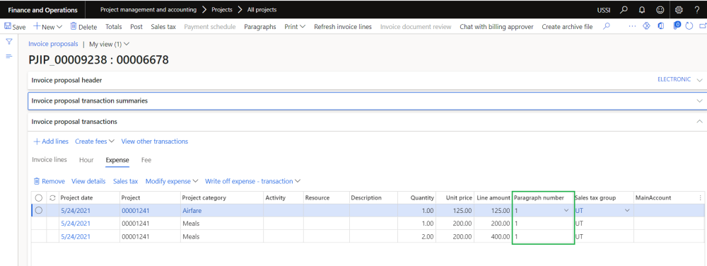 Once the paragraphs are attached on project invoice proposal form, user can select the paragraph number on the ‘Invoice transaction summary’ which will get defaulted on the transactions and user has an option to change the paragraph number for each transaction. Based on the paragraph number, transaction grouping will be displayed on the Invoice lines tab and on Invoice report.