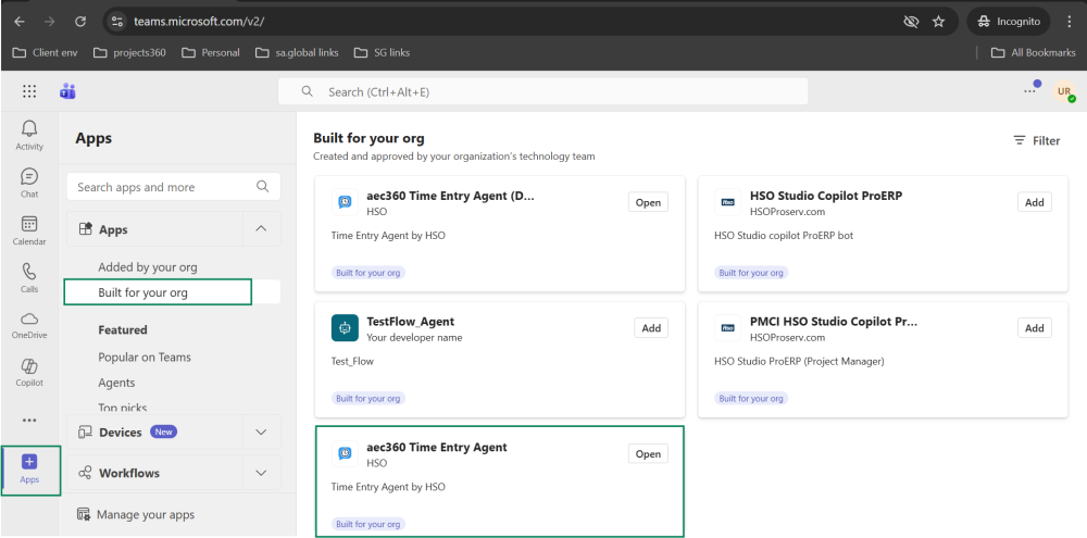 - In the Apps menu, scroll down to Build for your org. Here, you’ll see all custom Copilot agents deployed to the same Microsoft Teams tenant you’re signed into—this should correspond to your Finance and Operations (FO) environment.
