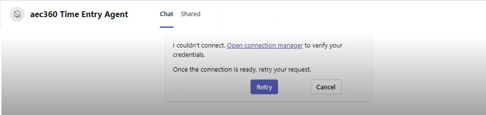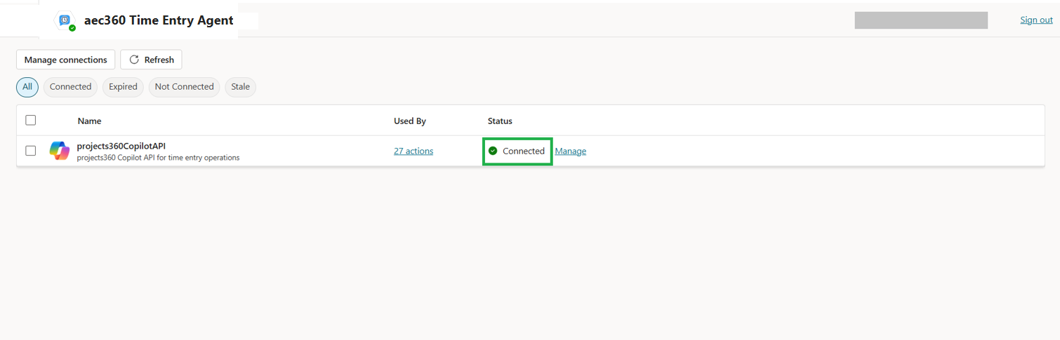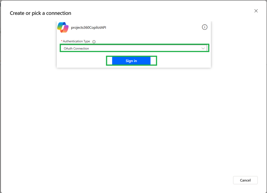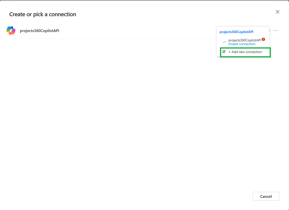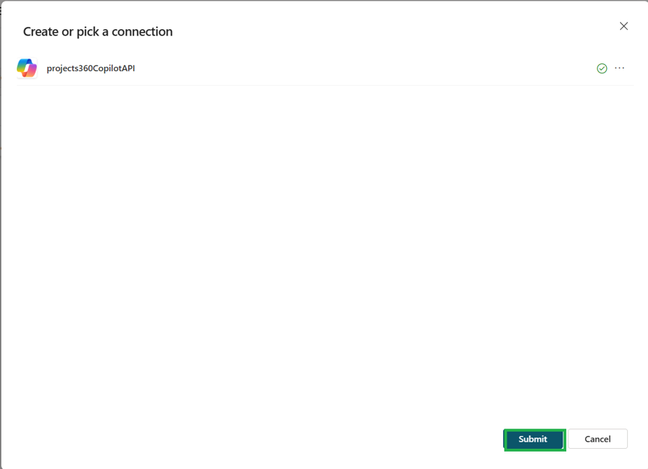 Click the Connect button next to the connection. This will open a dialog box, and then a second pop-up labeled “projects360 Copilot API” will appear.