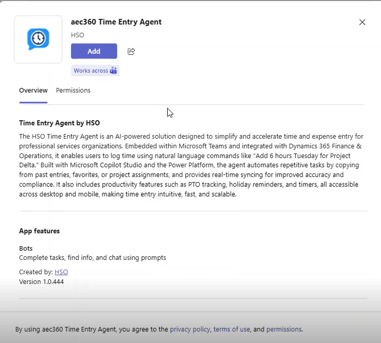 After selecting the correct Copilot custom agent in Microsoft Teams, you can create your timesheets and timesheet lines directly through the agent. Any information you enter will be automatically saved to the linked FO instance.