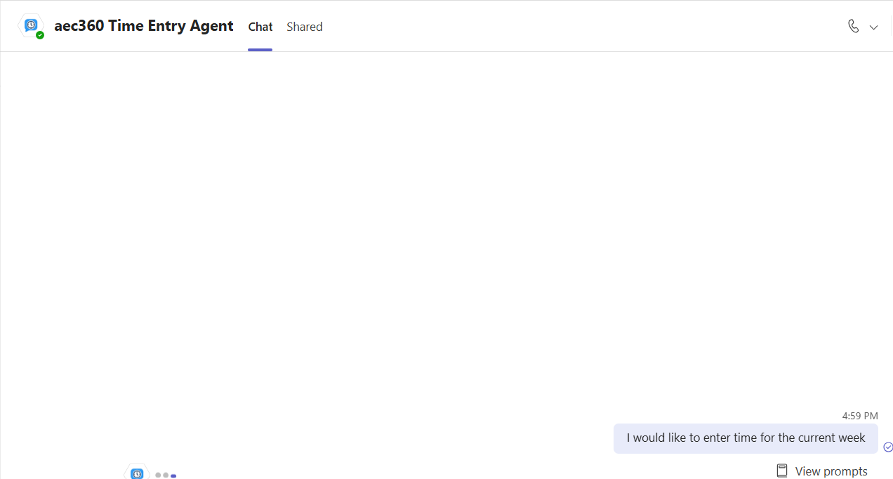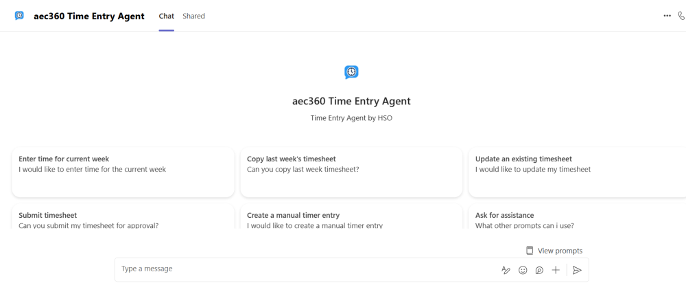 After signing in, you can use a variety of prompts to create time entries and time entry lines directly within the chat interface.