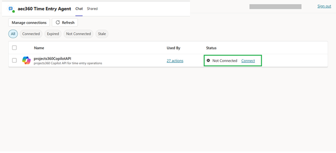 You will be redirected to a page in Microsoft Copilot Studio, where a connection will be displayed with the status “Not connected.”
