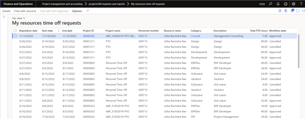 Go to Project management and accounting > projects360 Inquiries and reports > My resource time off requests.