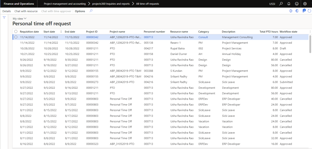 All the Personal time off requests are shown in the Personal time off requests inquiries form under the inquiries of Project module. The user can filter the Inquiry form with the employee name who has requested for Personal time off requests.