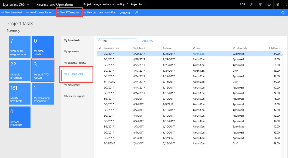 Personal Time Off has been added on the workspaces to make the information available to the user easily. All the Personal time off creation and inquiry options are available on the Project Tasks workspace.