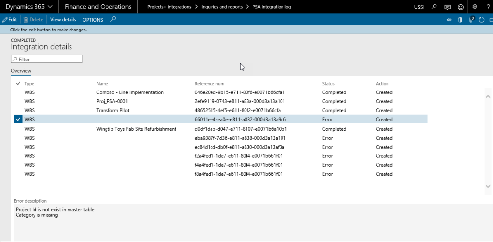 - Integrate the projects created in Project Service Automation application (PSA) to Microsoft Dynamics 365 for Finance and Operations and verify that records are successfully integrated.