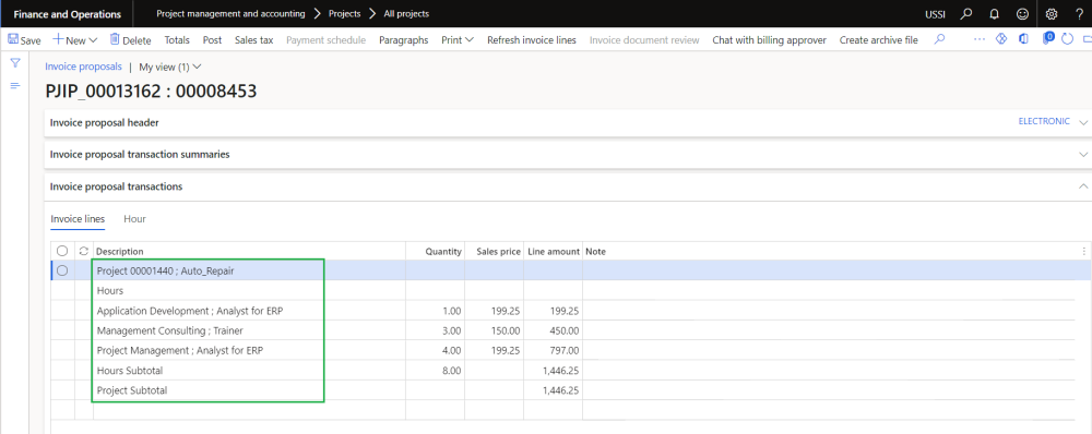 On project invoice proposal form, role billing description will be displayed only when the “Role” attribute is marked on the attached invoicing group and matches the role ID defined on the role billing description group ID which is attached on the funding source. It also matches the invoice date with the date range and the invoice language with the language defined on the Role billing description ID to display the billing description.