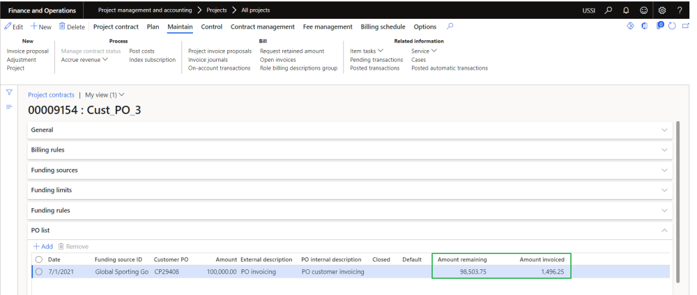 When the user updates the PO number on the posted invoices, Amount invoiced’ and ‘Amount remaining’ fields on the PO list will get updated on the project contract