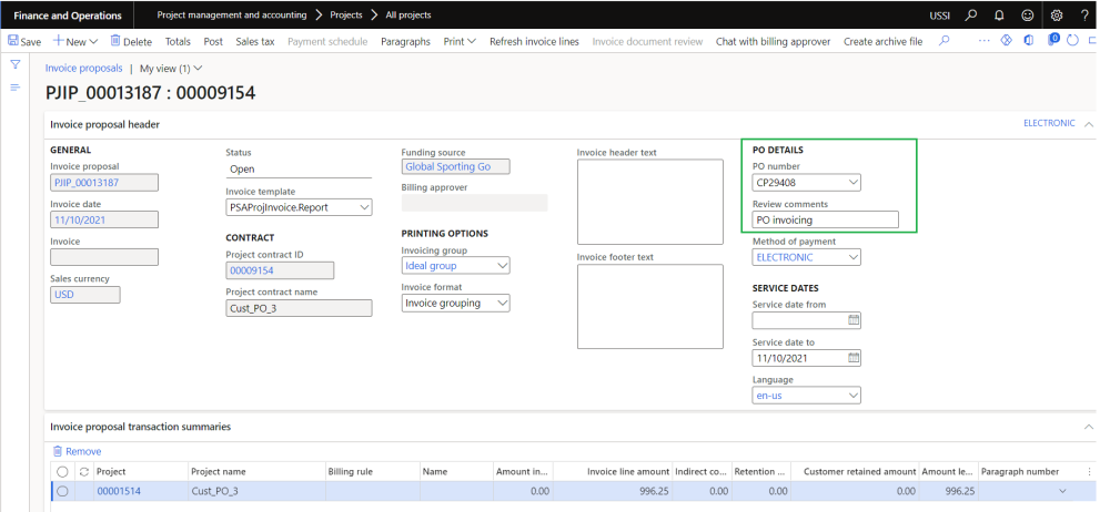 The default Customer PO details will be updated automatically in the customer PO field if Project contract contains PO line. The user can change the customer PO reference at the invoice proposal level.