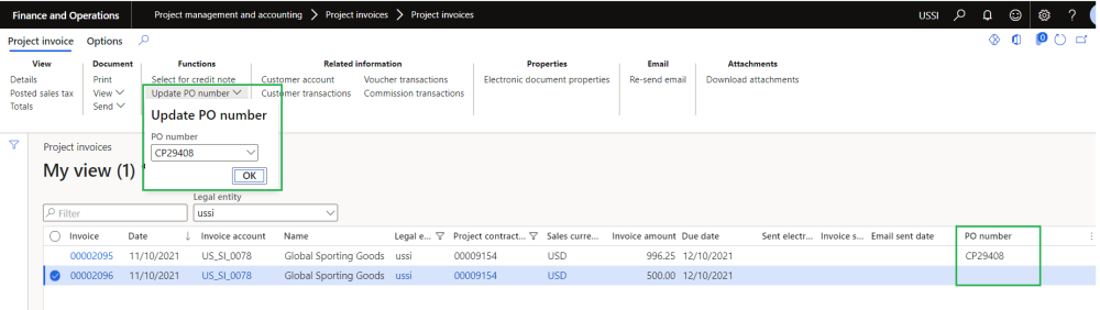 The user can update the PO number on the posted invoices. Update PO number button is provided to update the PO numbers on the posted invoices. The lookup displays all the PO numbers available from the invoice funding sources.