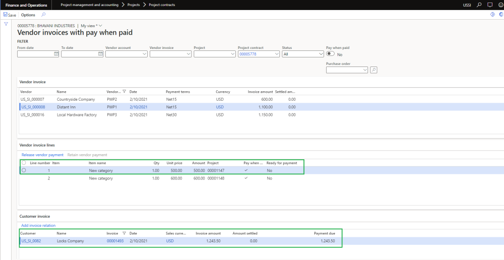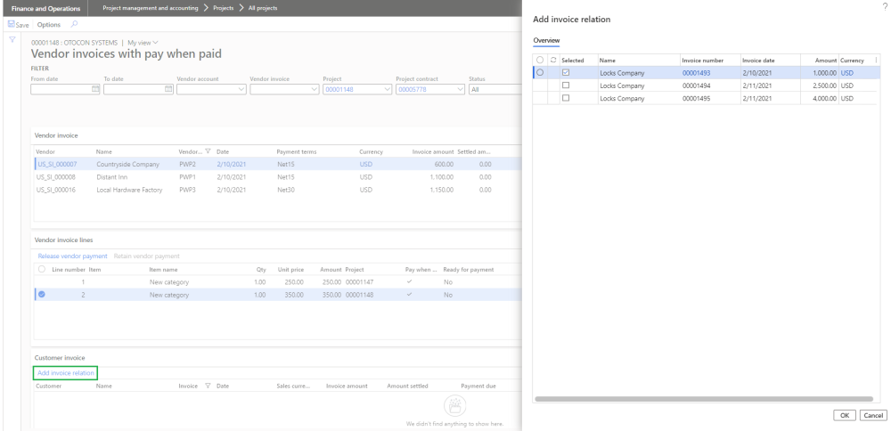 Once the project invoice proposal is posted, the standard process will create the relationship between Vendor invoice line and Customer invoice. User will be able to view this relationship on standard Vendor invoices with pay when paid form.
