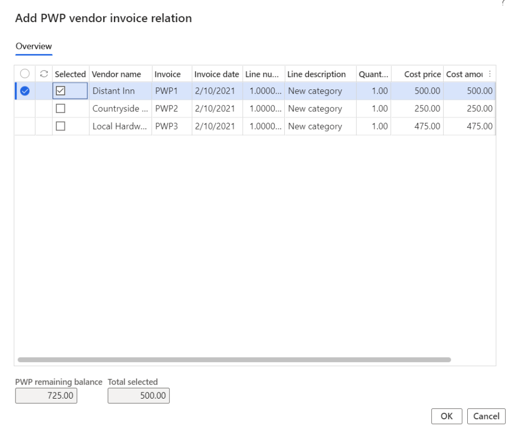 On the project invoice proposal when the user clicks on the button ‘Add PWP vendor invoice’ new form Add PWP vendor invoice relation form will be opened where the user can link the open vendor invoices manually to the project invoice proposal or if the “Auto-select vendor invoices” parameter is marked, all PWP open vendor invoices will get automatically linked.