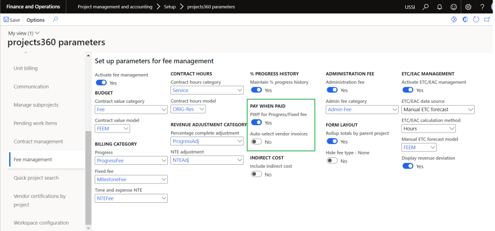 On the projects360 parameters form, new parameter is introduced ‘PWP for Progress/Fixed fee’ to control the pay when paid functionality for fixed fee and progress type of projects. User needs to set the “PWP for Progress/Fixed fee” field value to ‘Yes’ in order to use this feature.