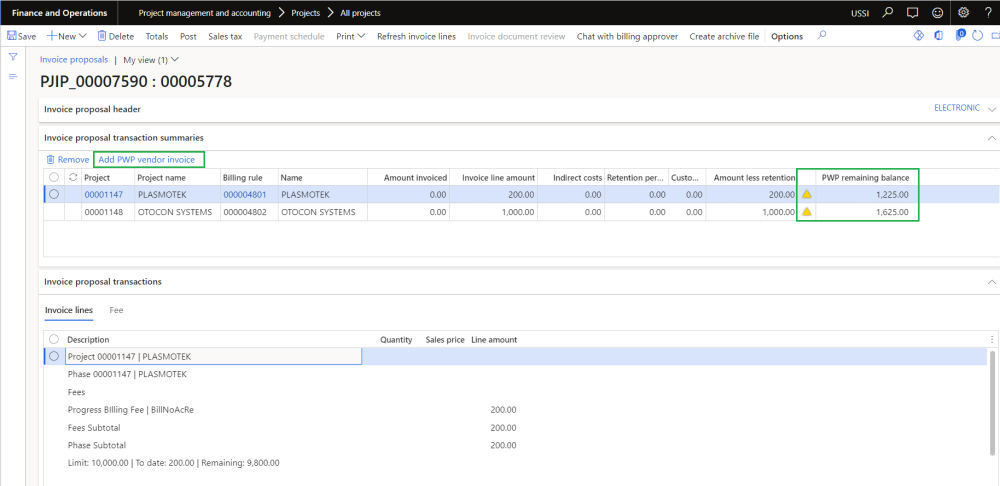 On the project invoice proposal form new field ‘PWP remaining balance’ is added where it displays the sum “Line amount” from all vendor invoice lines with PWP and without customer invoice related. Whenever there is a PWP balance more than zero yellow icon will be displayed for the user.
