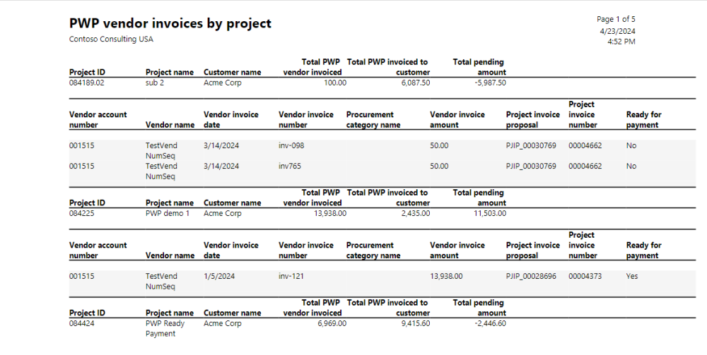 PWP vendor invoices by project