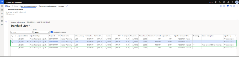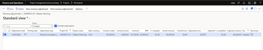 Revenue adjustments capabilities has been built on top fee management allowing us to adjust the accrued revenue getting the correct total revenue as well as WIP and % complete at given point of time. There could be scenarios where the actual work completed is more or less than then what’s been already billed to the client, in this case you can use the revenue adjustment capabilities bring back the project values to what’s expected.