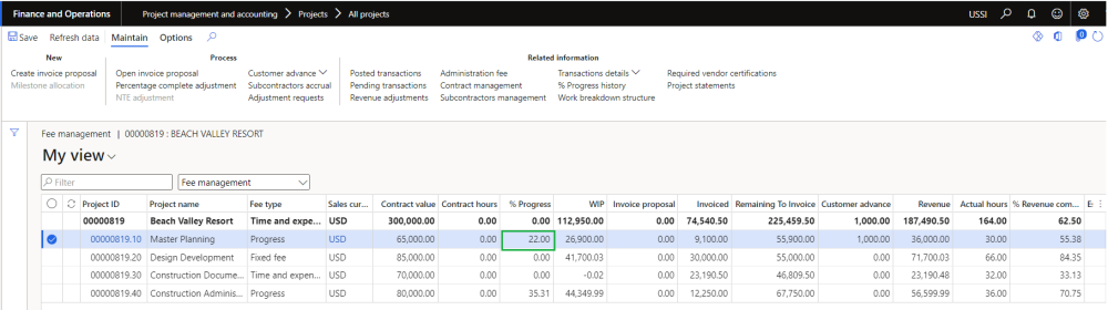 Once user select progress fee type project, Percentage complete adjustment button is enabled allowing users to perform revenue adjustment.