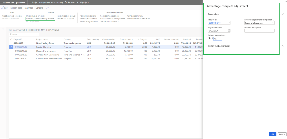 Go to Project management and accounting > All Projects > Fee management -> Percentage complete adjustment