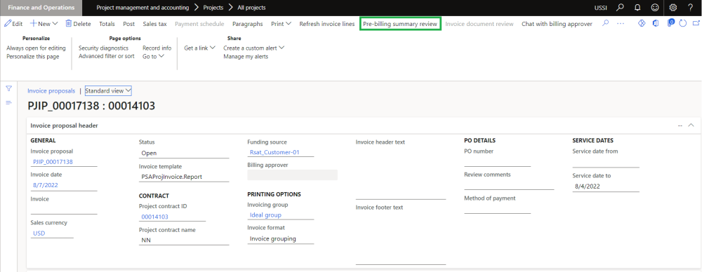 Pre-billing summary review” button will not be available if the invoice proposal is created through other than Billing schedule form.