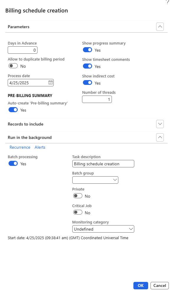 | Number of threads | Specify the number of threads to be used when billing schedule creation runs in batch mode. |